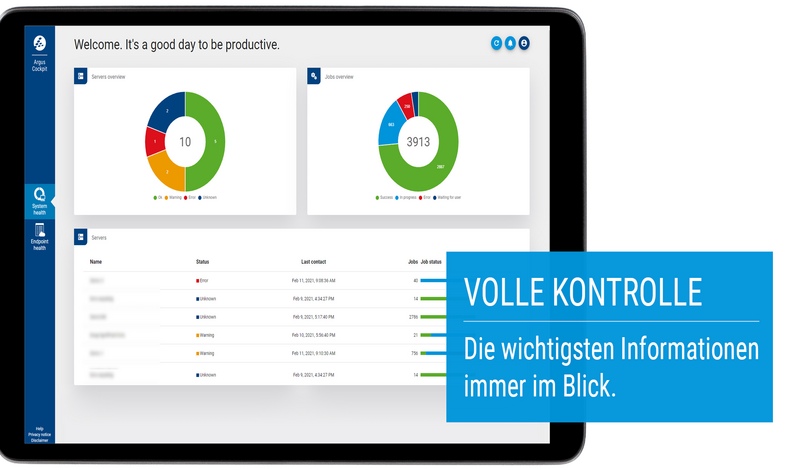 Die Lösung: Mit dem Argus Cockpit filtern Sie aus der Fülle an Daten schnell und mit wenig Aufwand alle relevanten Informationen heraus – unabhängig davon, wo Sie sich befinden und wie spät es ist. Handlungen und Anpassungen in der IT-Umgebung können damit schneller und zielgerichteter initiiert werden.